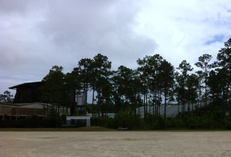 The grounds were locked, but you can see the back of the stage (dark, on left) and some of the stands (light grey in trees). It looks like an excellent venue with seating for 20,000. Then we came back to Lucky Us for a short nap...